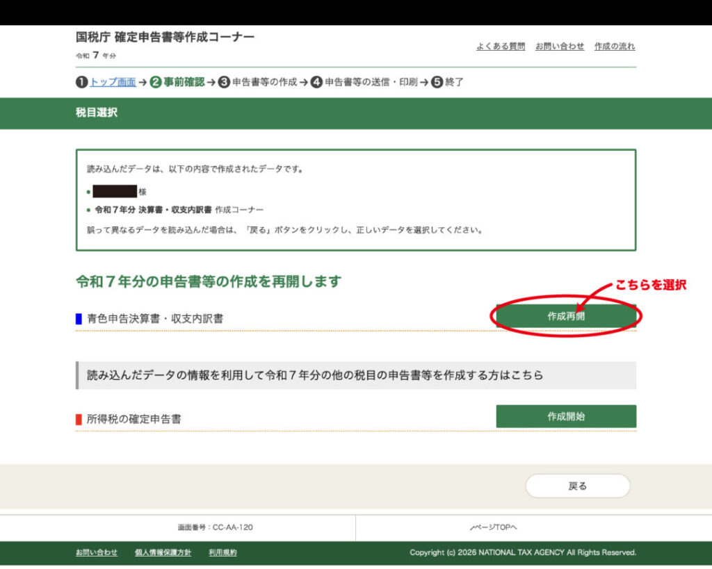 5、青色申告決算書・収支内訳書の「作成再開」をクリック