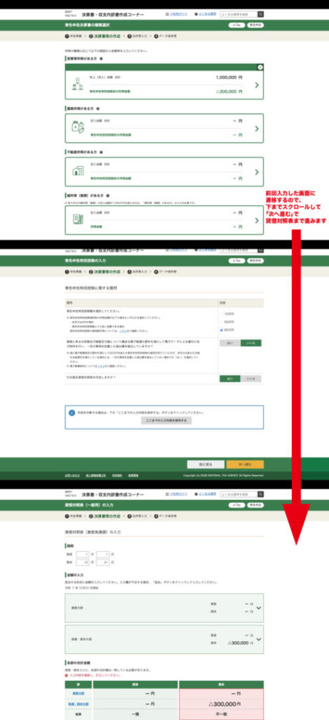 ここまでで前回の保存データを開いて貸借対照表の入力ページに遷移することができました。