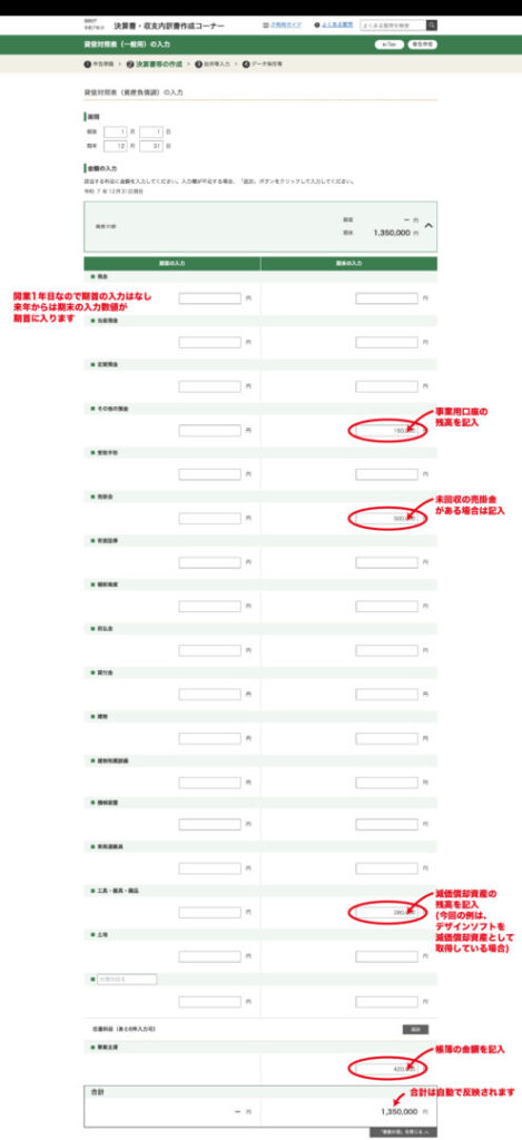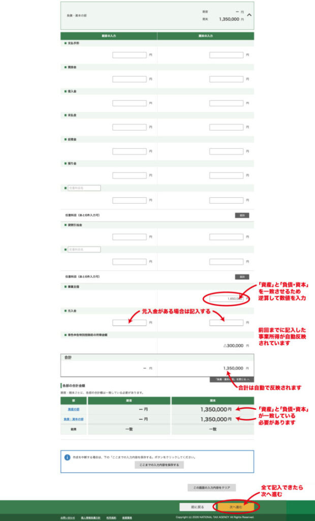 最終的に「資産」と「負債・資本」の合計が一致するように逆算して「事業主借」の数値を記入します。