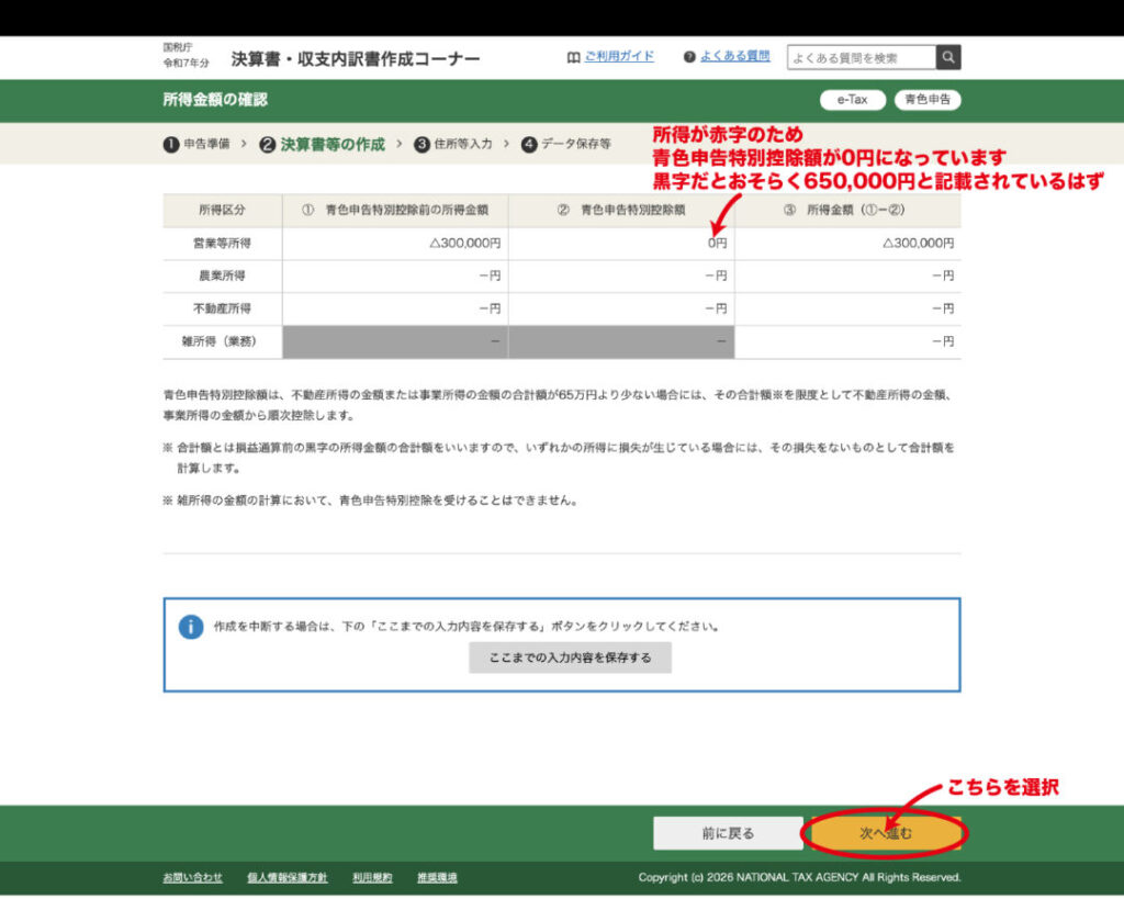 今回は所得が赤字のため青色申告特別控除額が0円となっています。