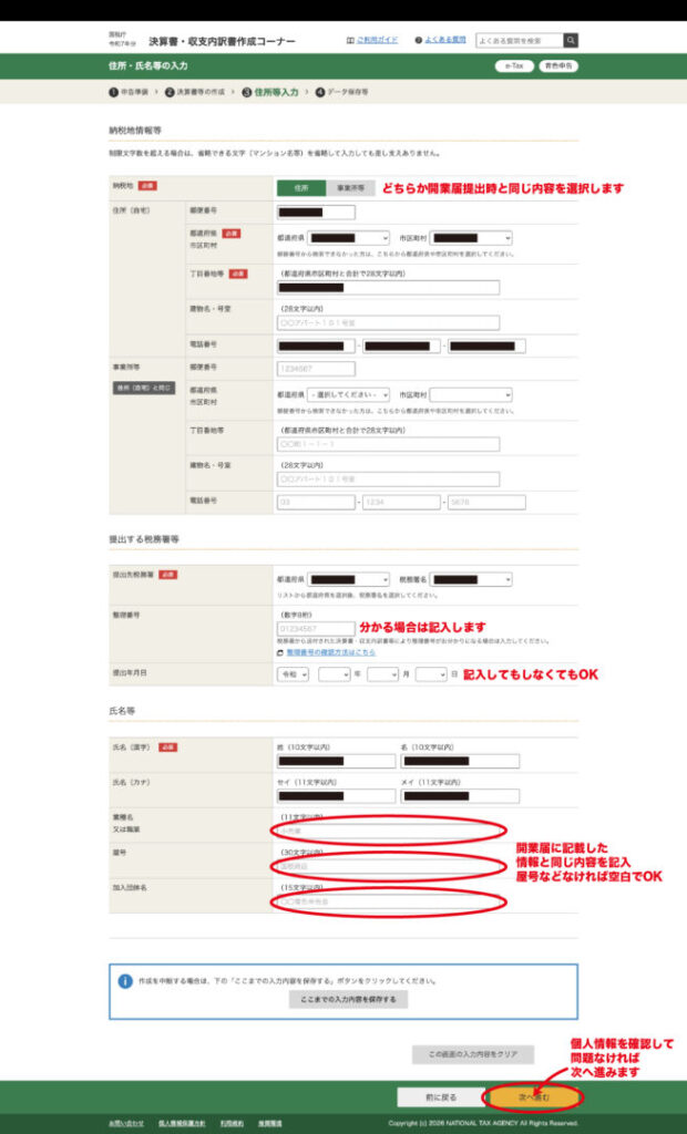 納税地や業種名などは開業届に記載した内容と同じ内容を記入します。