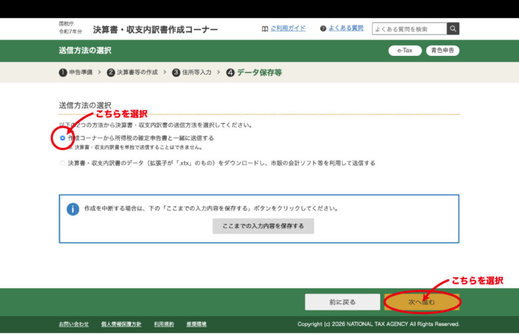 「作成コーナーから所得税の確定申告書と一緒に送信する」を選択します。