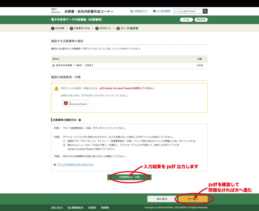 「決算書等表示・印刷」からpdfをパソコンにダウンロードできます。